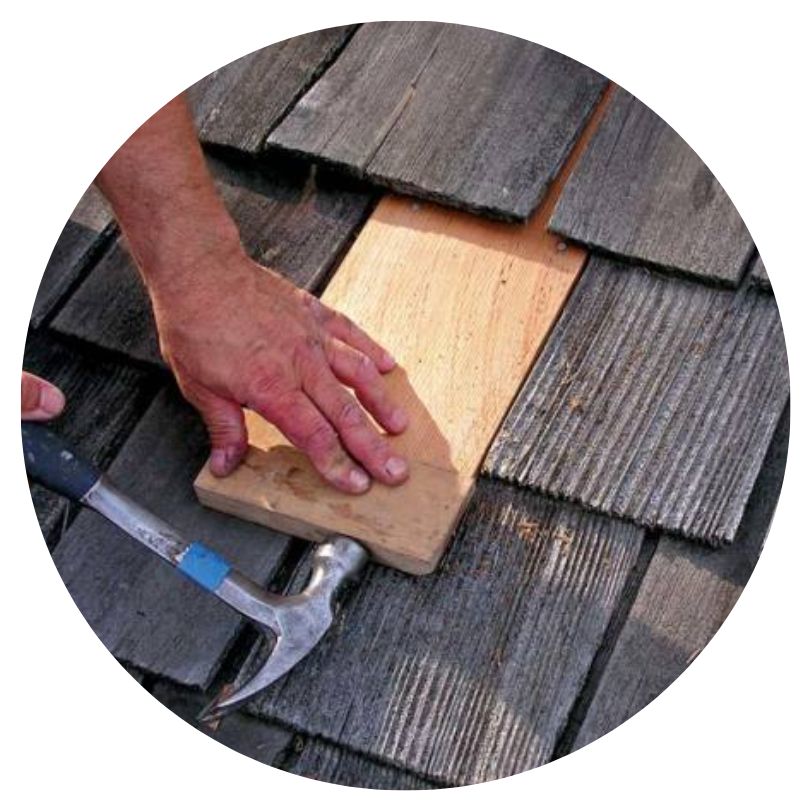 We repair your cedar roof by replacing damaged shingles, installing shims and replacing or re-nailing ridge caps.
