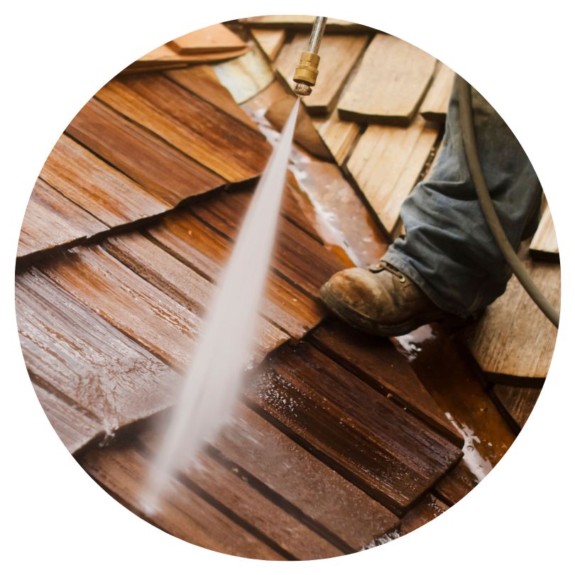 We use low pressure washers and proper techniques to avoid damaging your cedar roof. A regular (high) pressure washer and improper use could potentially damage your cedar roof.